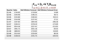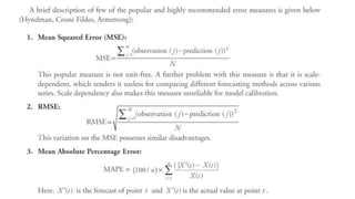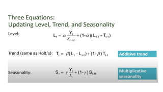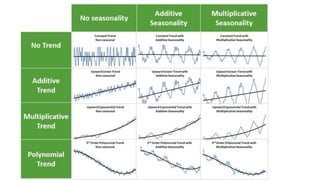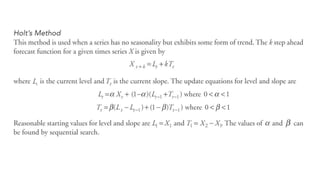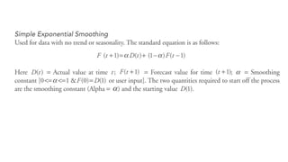 Time series analysis involves collecting past observations of a variable to develop a model that can be used to forecast future values. The basic idea is that history can predict the future. A time series typically contains trend, seasonal, cyclical, and irregular components. Common time series models include exponential smoothing, Holt-Winters, and ARIMA. Exponential smoothing assigns more weight to recent observations. Holt-Winters extends exponential smoothing to account for trend and seasonality. ARIMA models past values and errors to forecast the future. Determining the appropriate ARIMA model requires identifying the degree of differencing needed to make the time series stationary.