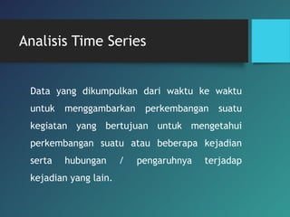 Analisis time series digunakan untuk menganalisis data yang terkumpul secara berkala untuk melihat perkembangan suatu kejadian dan hubungannya dengan kejadian lain. Metode yang digunakan untuk menganalisis trend antara lain metode tangan bebas, rata-rata semi, dan rata-rata bergerak.