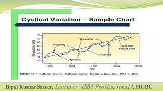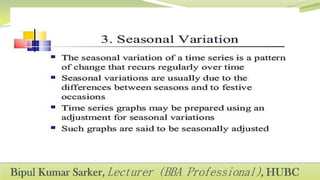 This document defines time series and its components. A time series is a set of observations recorded over successive time intervals. It has four main components: trend, seasonality, cycles, and irregular variations. Trend refers to the overall increasing or decreasing tendency over time. Seasonality refers to predictable changes that occur around the same time each year. Cycles have periods longer than a year. Irregular variations are random fluctuations. The document also discusses methods for analyzing time series components including additive, multiplicative, and mixed models.