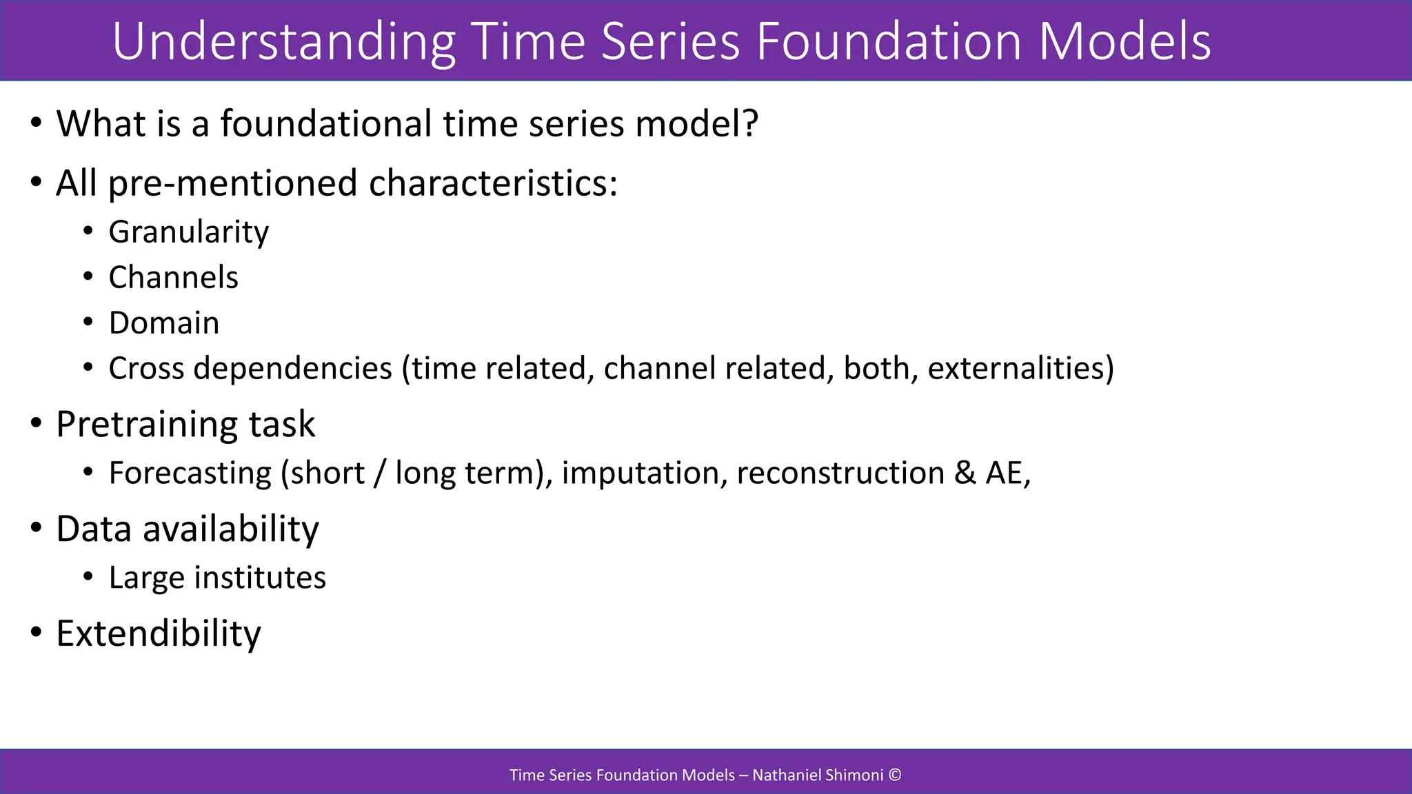 The document discusses foundational time series models (TSFMs), highlighting their characteristics like granularity, domain dependencies, and forecasting capabilities. It reviews notable TSFM developments, including Chronos, TimesFM, Moirai, and Moment, noting their competitive performance against traditional methods and their innovative architectures. Additionally, it addresses future directions and improvements in multi-target and multi-modal training.