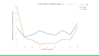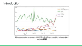 This document analyzes COVID-19 case and death data from April and May 2020 in 6 countries. It presents plots of new cases and deaths over time. It discusses differences between countries in total population, measures taken, testing levels, culture and HDI that influence case and death rates. It also examines differences over time, finding the US peak was much higher than UK and France in late March and lockdowns reduced cyclicality of French data versus UK data. The document concludes there are numerous differences between countries and over time and puts forth some hypotheses for these differences.