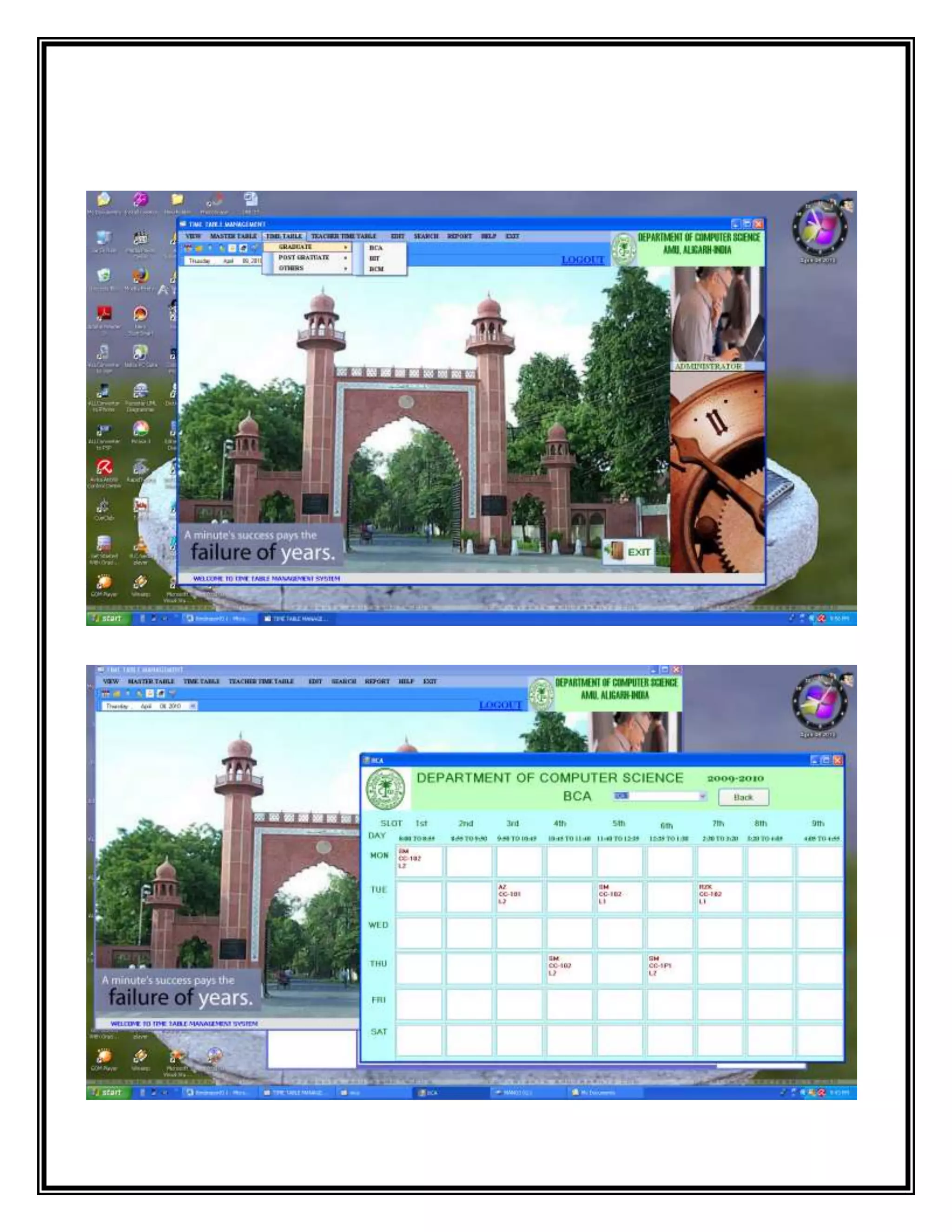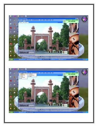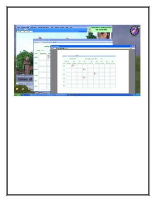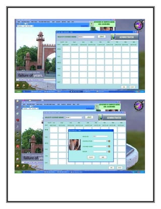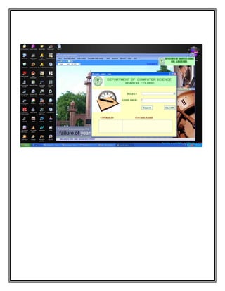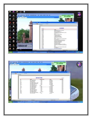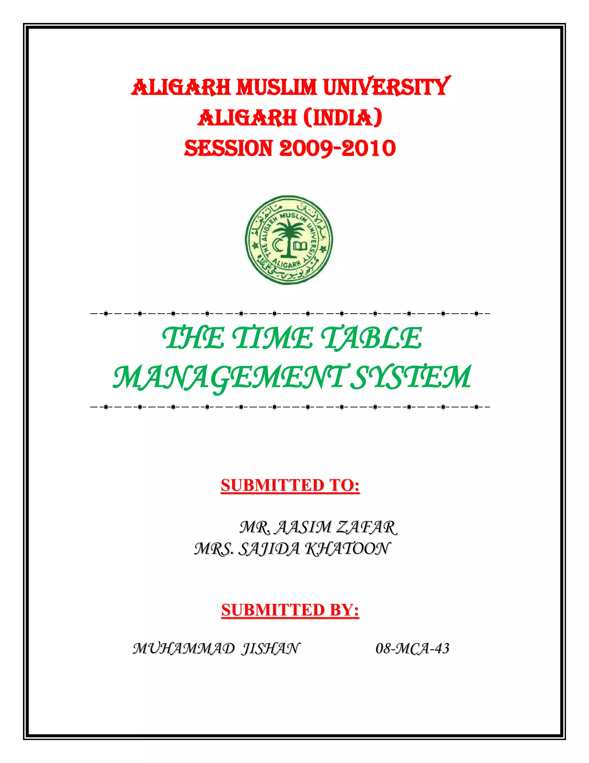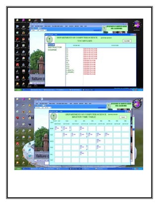 The document details the development of a Timetable Management System for Aligarh Muslim University, which aims to automate the semester course scheduling process by solving constraint satisfaction problems related to time slots, room assignments, and instructor availability. The project, guided by Mr. Aasim Zafar and aided by Mrs. Sajida Khatoon, utilizes Visual Basic .NET and focuses on implementing an efficient algorithm to accommodate both hard and soft constraints. Future enhancements include integrating with the current student database and improving the system's user interface and functionality.