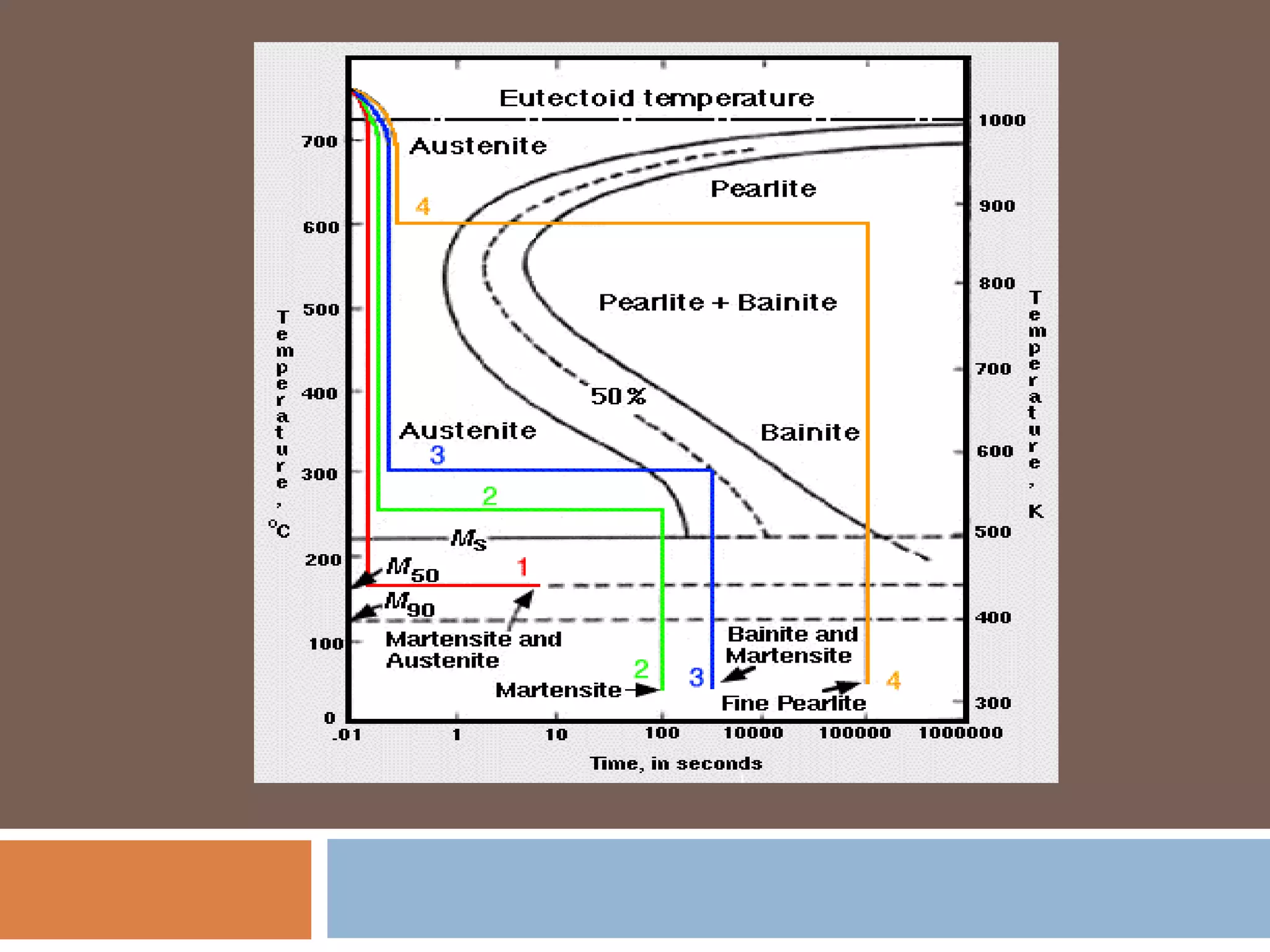3) Different cooling processes (paths on the TTT diagram) will result in different microstructures like martensite, bainite, or pearlite, with martensite being the hardest and strongest and
