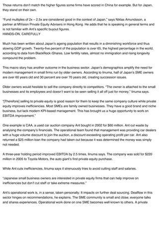- Ant Capital Partners is a small, private equity firm in Japan that focuses on operational improvements for small-to-medium enterprises (SMEs) through buyout deals typically between $50-150 million.