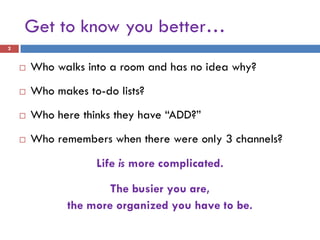 The document discusses effective time management strategies to improve productivity and reduce stress in both work and home life. It emphasizes the importance of planning, prioritizing, and utilizing appropriate tools, while also addressing the negative impacts of clutter and distractions. The author, Kimberly Medlock, proposes six key areas for productivity success and encourages individuals to eliminate unnecessary activities and simplify their processes.