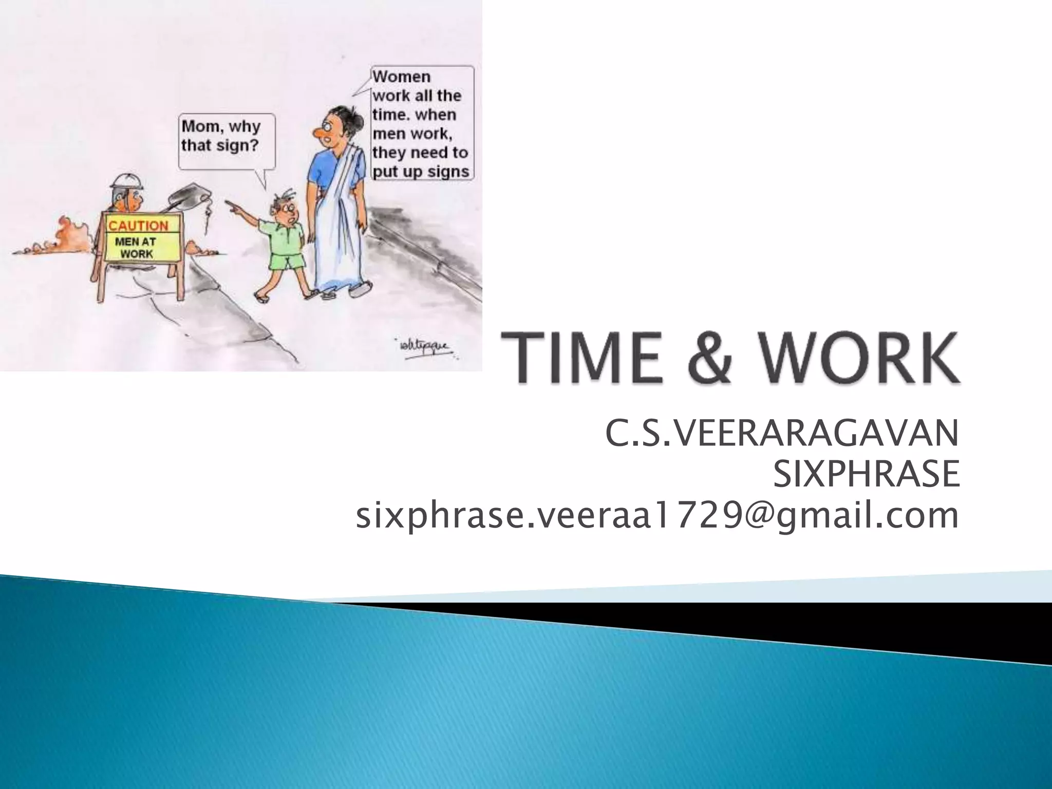 The document contains information about work formulas used to calculate the time taken to complete a task when multiple workers are involved. It provides formulas to calculate the time taken when: