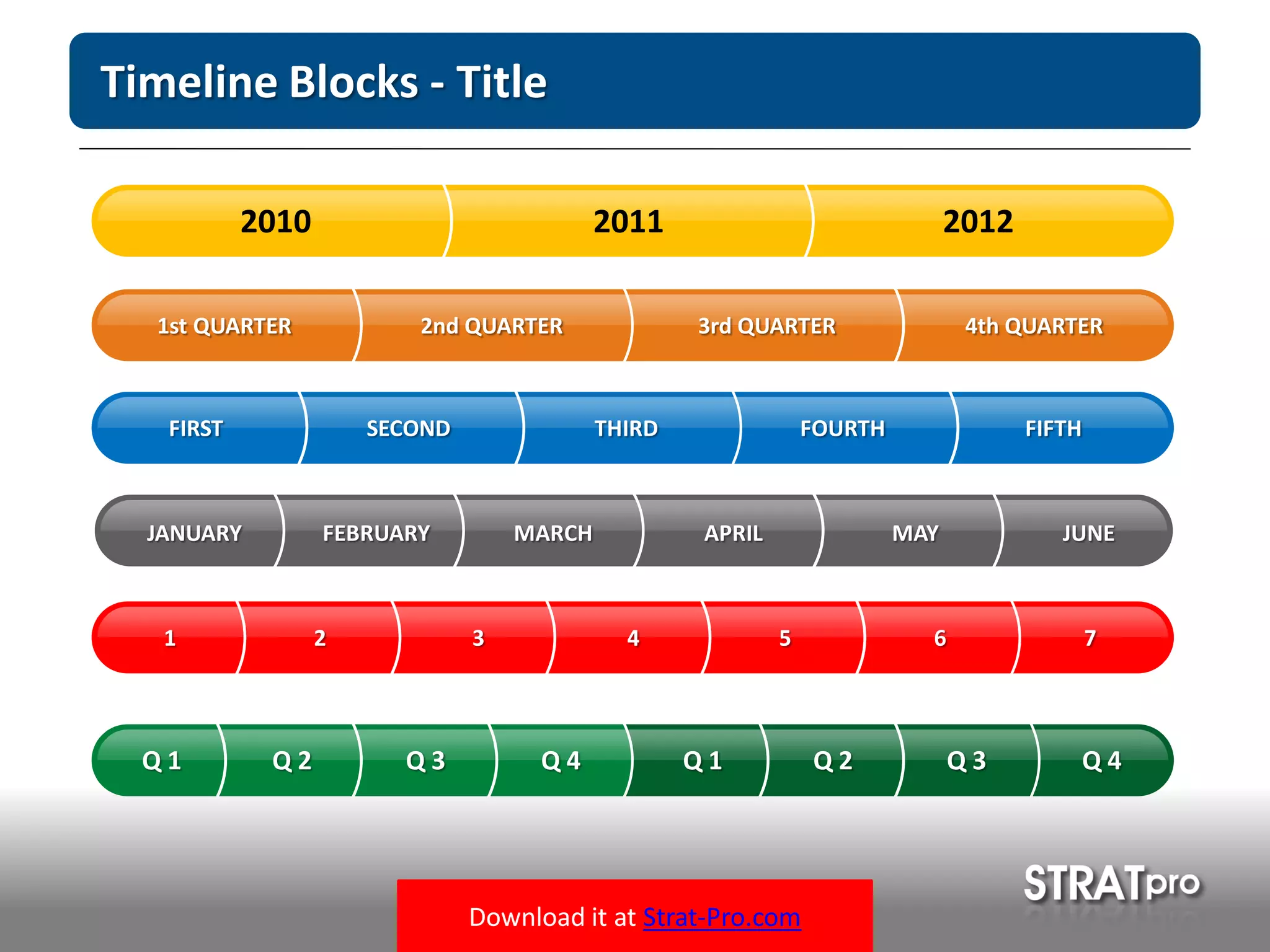 The document provides instructions for creating a timeline using blocks. It shows examples of timeline blocks for years, quarters, months, and individual dates that can be clicked on to insert text. The instructions emphasize keeping any inserted text brief and simple.