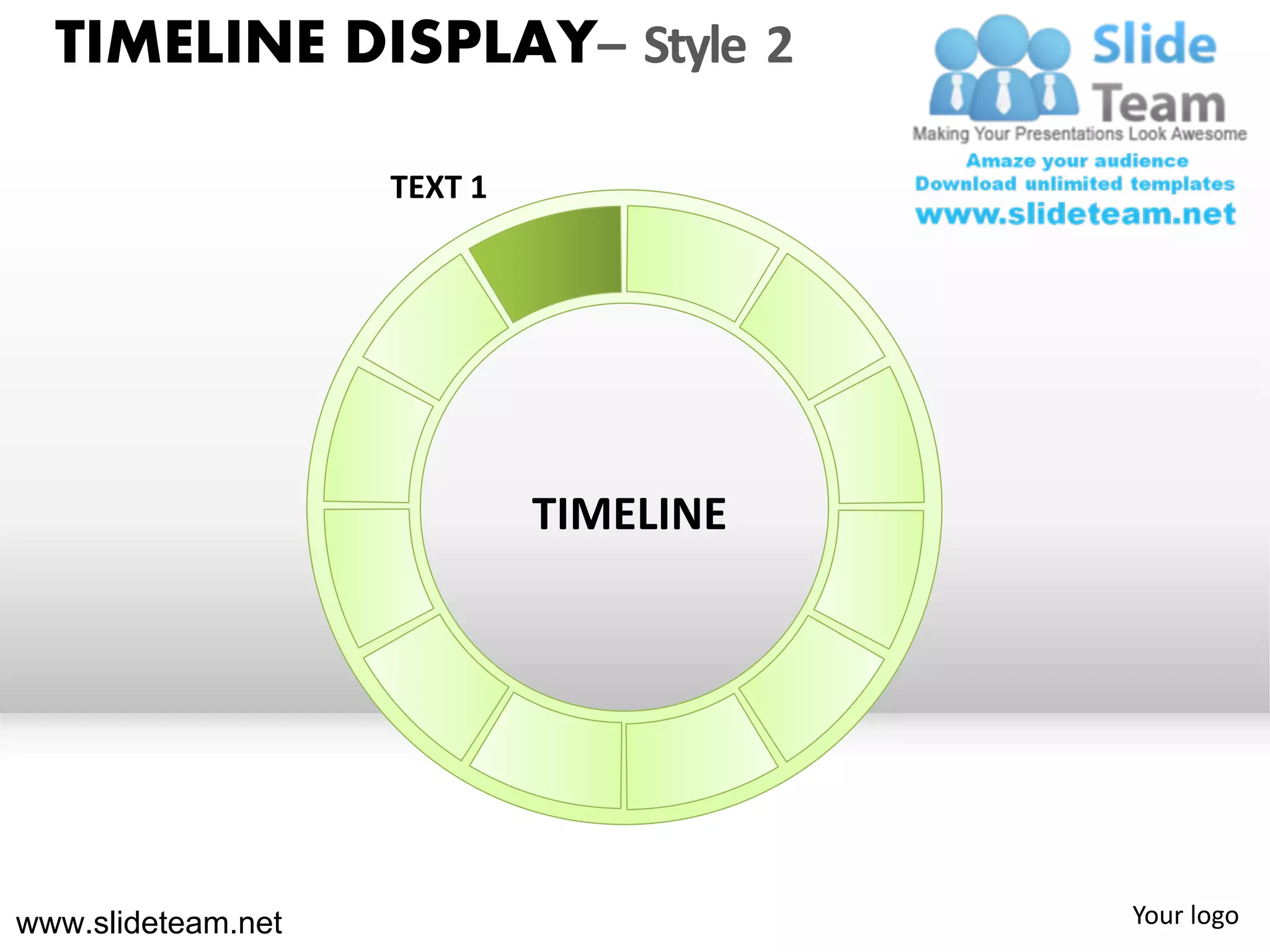 The document displays a timeline with 12 text boxes arranged vertically. As more text boxes are added, the timeline expands downward. Each text box can be edited individually for content and formatting. The timeline can be formatted to display ranges of months or years. All images are fully editable in PowerPoint to allow customization of colors, sizes, and orientations. Individual objects can be ungrouped and formatted separately.