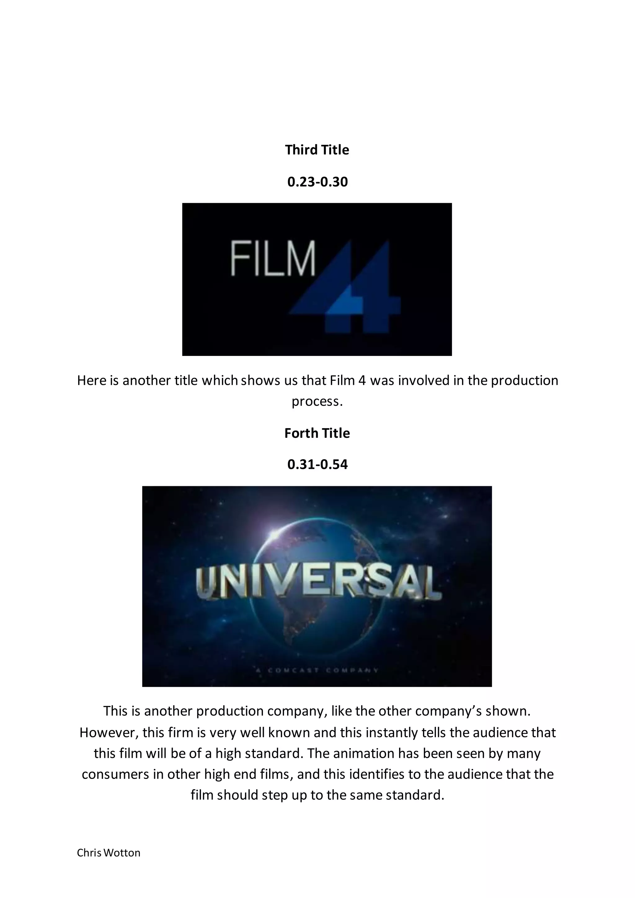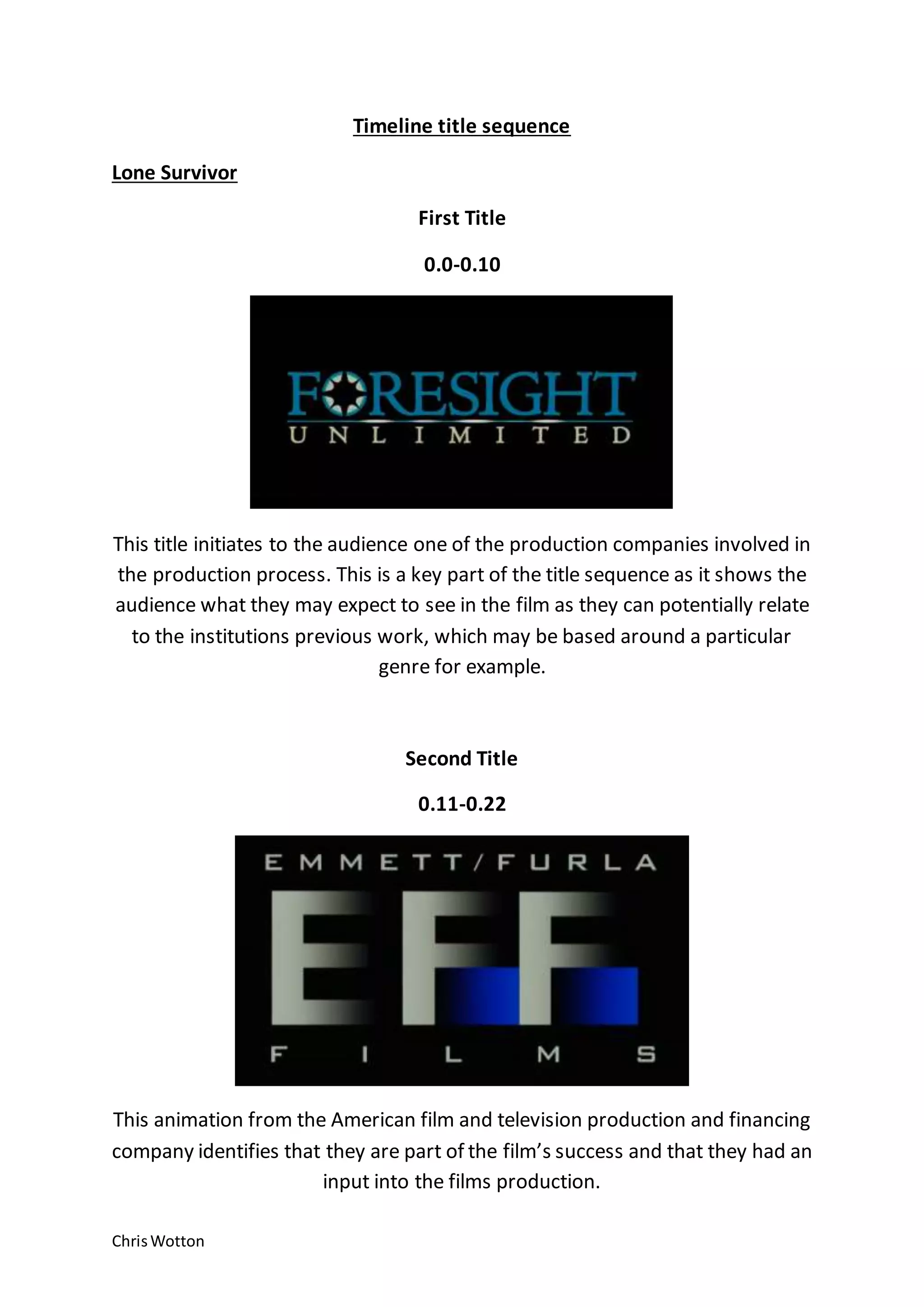 The document provides an analysis of the title sequences of two films: Lone Survivor and The Bourne Ultimatum. For Lone Survivor, the summary notes that the title sequence introduces several production companies and identifies key actors to attract audiences. The Bourne Ultimatum has fewer titles that only identify one major production company and the film's location to build anticipation. Both sequences aim to establish credibility through well-known institutions but only Lone Survivor promotes key actors.