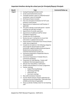 The document outlines important tasks and timelines for principals and deputy principals throughout the school year. Key tasks include finalizing class lists and timetables in August, implementing learning support structures and conducting fire drills in September, organizing parent teacher meetings and option information evenings in January, managing the student enrollment process in February and March, arranging state examinations in March, and planning for the next school year in June. The timeline provides guidance for principals on administrative responsibilities month-by-month.