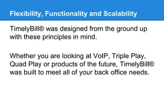 TimelyBill® is a comprehensive operations support system designed for communications providers and enterprises, offering extensive customization and integration capabilities. It supports various services such as billing, call center operations, and technical support, making it flexible and scalable for different organizational needs. The system is also designed to be more affordable for smaller organizations, with additional features available as they grow.
