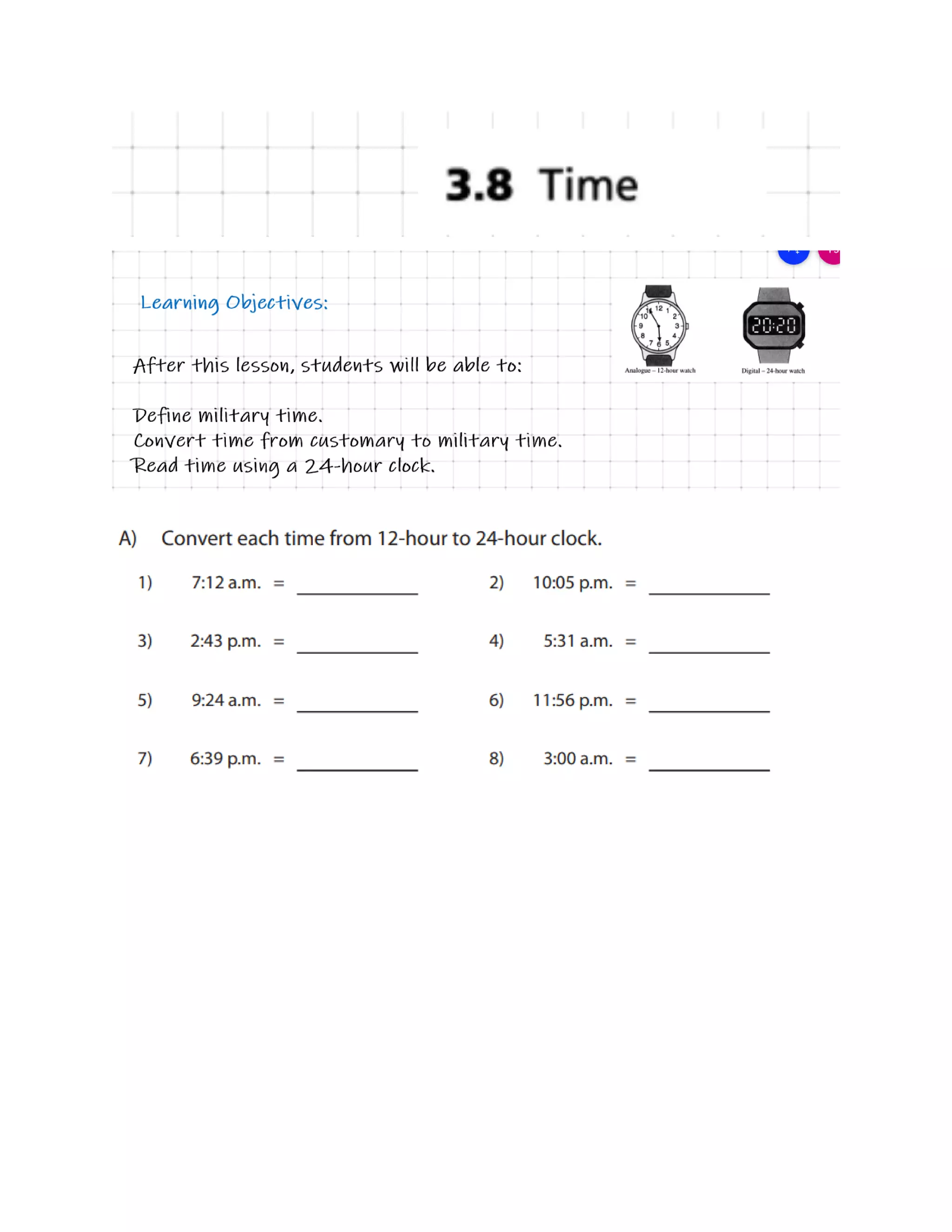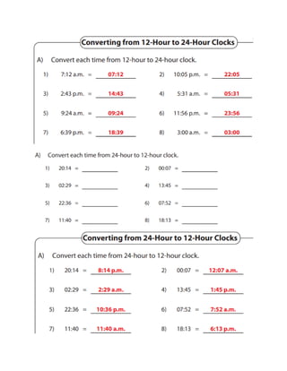 This document provides instructions for converting between 12-hour and 24-hour time formats. It explains that to convert a 24-hour time to 12-hour, one subtracts 12 if the hour is greater than 12 or changes 00 to 12am. When converting 12-hour to 24-hour, 12pm becomes the hour and 12am becomes 00, while other pm times have 12 added to the hour. The minutes and seconds never change between the two formats.