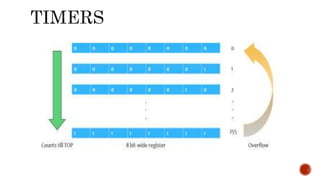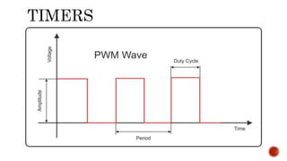 Interrupts allow a microcontroller to pause its current task and execute an interrupt service routine (ISR) in response to an event. Common events include timer overflows and external pin changes. Each interrupt has an associated flag bit and enable bit that allow the interrupt to be triggered and responded to. Timers can generate interrupts and also be used for pulse width modulation to create analog outputs from digital signals.