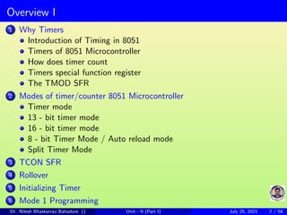 The document discusses timers in 8051 microcontrollers. It describes the different modes timers can operate in, including 13-bit, 16-bit, and 8-bit auto-reload modes. It explains the timer-related special function registers TMOD, TCON, THx and TLx. It provides steps for initializing timers, programming timers in mode 1, and calculating time delays. The document is intended to provide an understanding of how to generate time delays, measure time, and count pulses using the timers in 8051 microcontrollers.