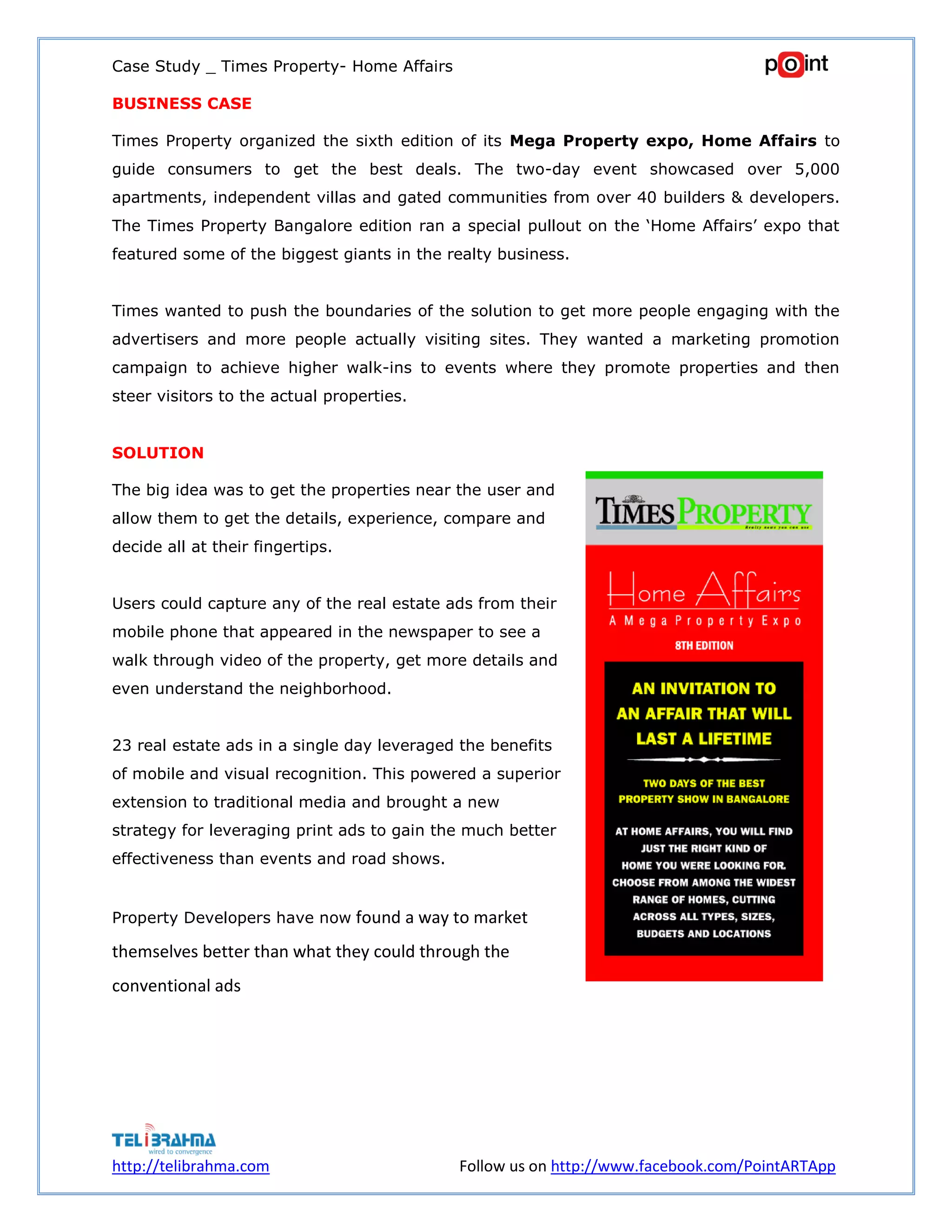 Times Property organized a two-day real estate expo called Home Affairs to showcase properties from over 40 developers. They wanted to promote the expo and drive more visitors to properties. Their solution was a mobile app that allowed users to scan real estate ads from the newspaper to view videos and details of properties, compare options, and contact realtors. On the first day, 23 ads were scanned over 28,500 times for a total of 3,000 hours of virtual property tours. 20% of users who engaged contacted realtors. The campaign was highly successful in marketing properties.