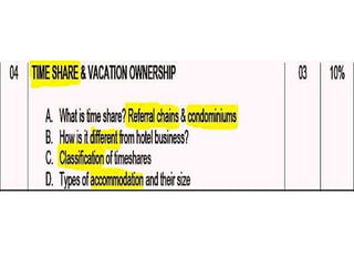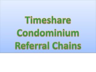 This document provides an overview of timeshare concepts. It defines timeshare as a form of vacation ownership where multiple parties hold rights to use the same property for allotted periods. It discusses the main types of timeshare ownership including deeded, leased, and points-based systems. Key factors that determine timeshare prices like location, season, unit size are outlined. The benefits of timeshare like larger accommodations and exchange options are also summarized.