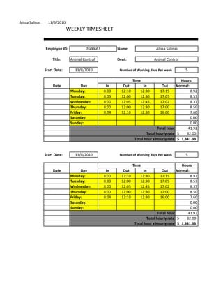 Alissa Salinas worked as an Animal Control employee for the week of November 8, 2010. She worked 41.92 hours over 5 days at an hourly rate of $32. She worked between 8 and 12.5 hours each day, with a total pay for the week of $1,341.33.