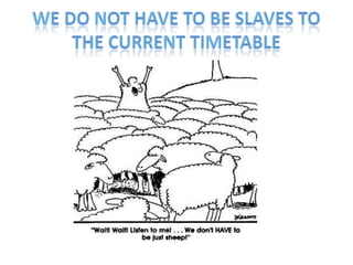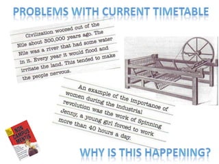 The document proposes a new student schedule model organized by grade-specific pods to address issues with the current inflexible secondary timetable model. Each pod would have 3 core subject teachers who work together closely to provide integrated, personalized learning experiences for their 90 students. Examples of benefits include increased flexibility, deeper student-teacher relationships, and more opportunities for inquiry-based learning. Teachers are seeking feedback on the proposal.