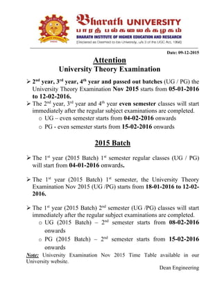 The document provides information about the University Theory Examination schedule for November 2015. It lists the exam dates and subjects for undergraduate and postgraduate students from years 1-5 of various programs like engineering, architecture etc. It also provides the start dates for the next semester classes after completion of exams.