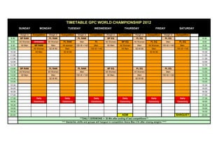 The document outlines the timetable for the GPC World Championship 2012 held from Sunday to Saturday. It details the daily schedule for weigh-ins and competitions in powerlifting (PL) and bench press (BP) across all gender and weight categories. The events include opening ceremonies, daily ceremonies after each competition session, and a banquet on the final day.