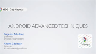This document discusses techniques for building advanced Android applications. It covers topics like maintaining freshness with location and data updates while minimizing battery drain, adding intelligence with suggestions and account/device syncing, ensuring smoothness by offloading tasks to background threads, following an "invisible" design with standard patterns, prioritizing efficiency through low battery usage and intelligent updates, and testing for reliability. The overall message is to build applications that are fresh, intelligent, smooth, invisible, efficient and reliable.