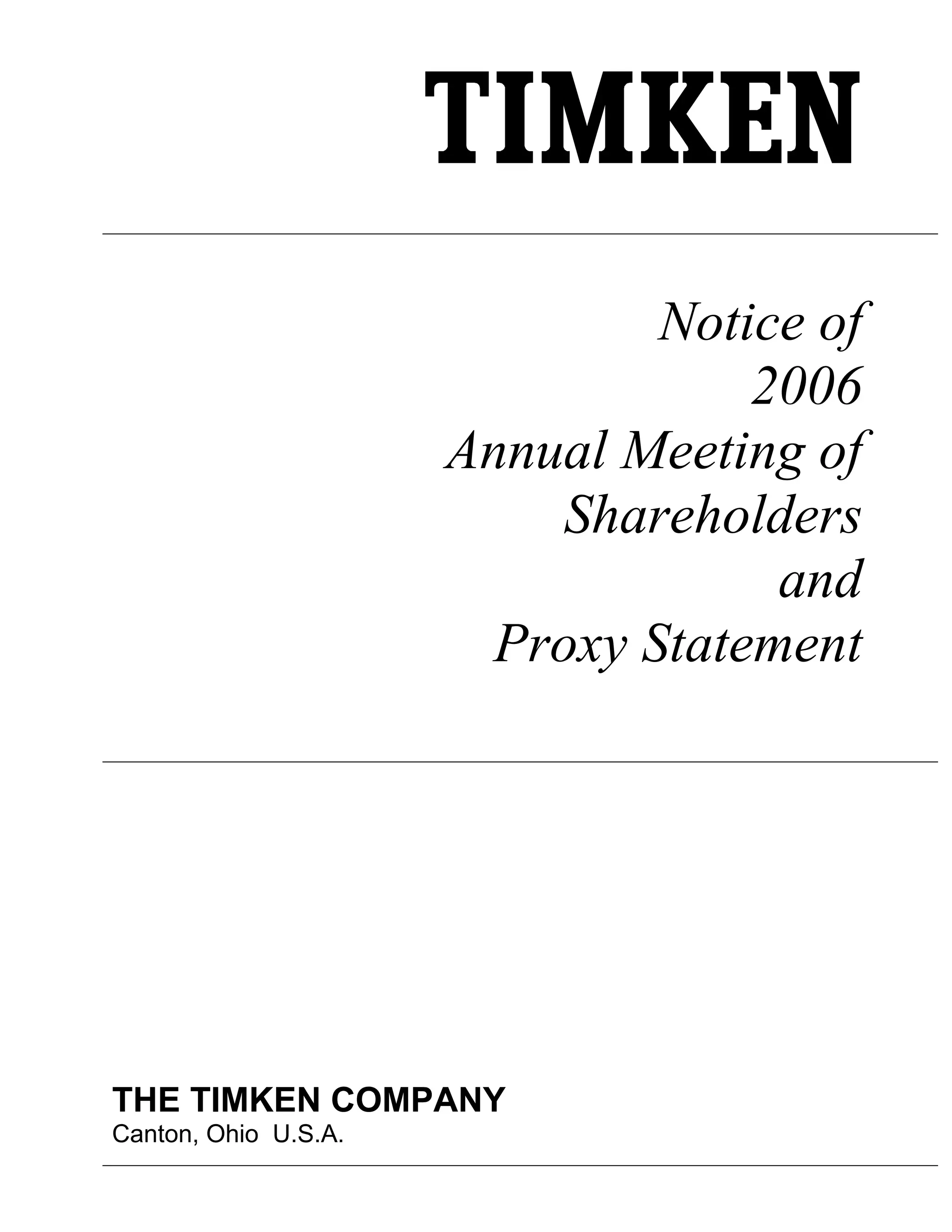This document provides notice of and information for The Timken Company's 2006 Annual Meeting of Shareholders, including notice of the meeting, proxy statement, election of three Class III directors, information on continuing directors, and various committee reports and other business. Shareholders are being asked to elect three Class III directors and conduct any other business properly brought before the meeting.