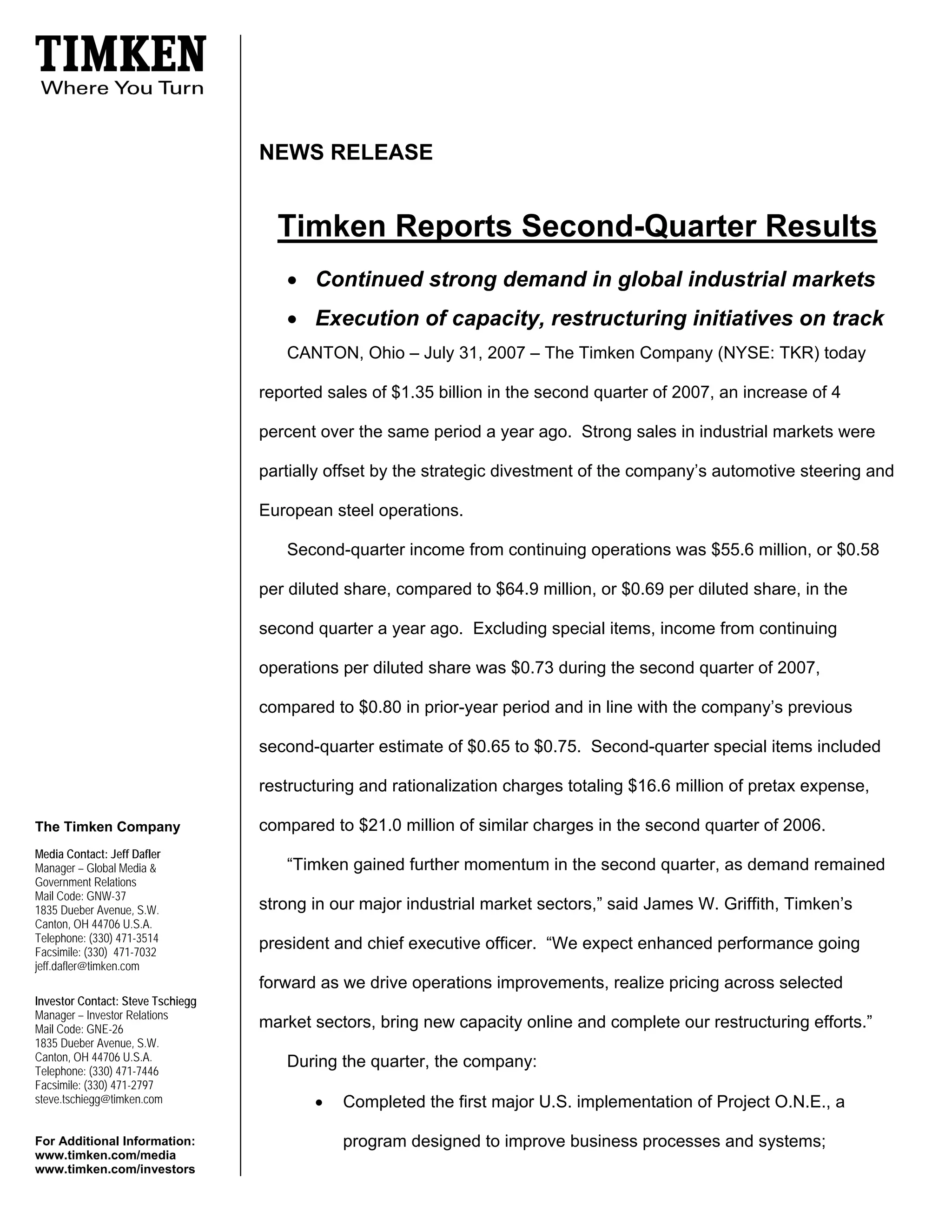 - Timken reported second quarter sales of $1.35 billion, up 4% from the previous year, driven by strong demand in industrial markets. Income from continuing operations was $55.6 million or $0.58 per share. - Excluding special items, income from continuing operations was $0.73 per share, in line with estimates. Special items included $16.6 million in restructuring charges. - Timken expects enhanced performance for the rest of the year driven by strong markets, capacity additions, and operating improvements. Earnings per share are forecast to be between $2.60-2.70 for the full year.