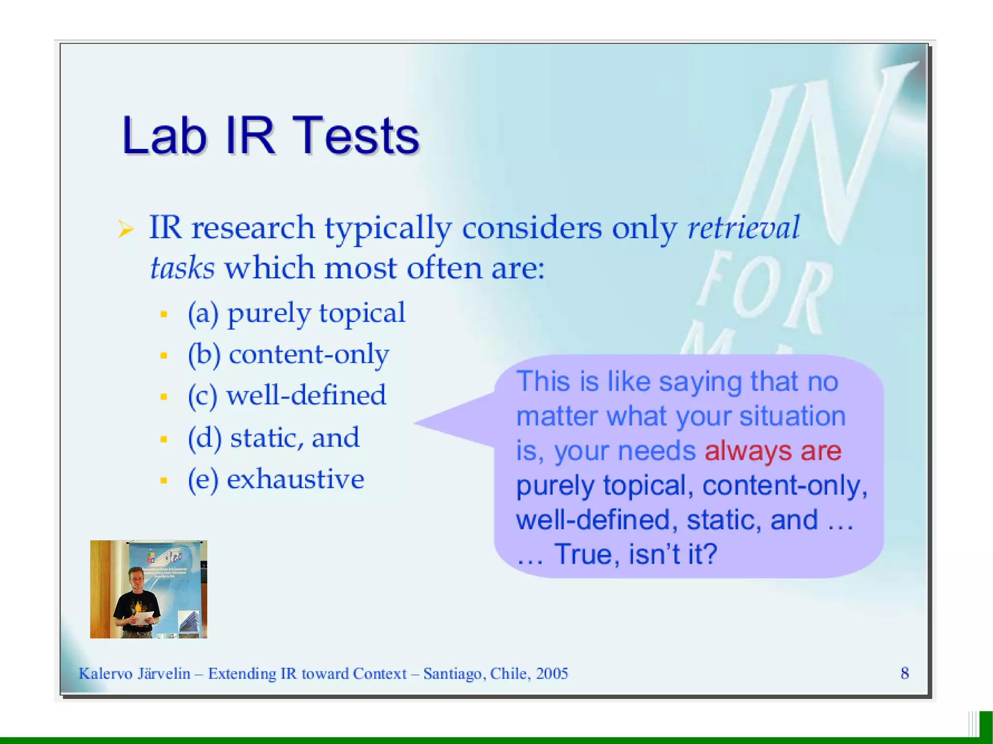 This document discusses relevance and meaning between objective and subjective perspectives. It notes that each individual has a different cognitive composition and behavioral disposition, and users vary in their knowledge, motivation, search skills, and task needs. It also discusses exploring meaning in humans and machines through fields like information retrieval, content analysis, natural language processing, and cognitive science. Finally, it acknowledges Jorma Laaksonen and Mikko Kurimo's research teams at Aalto University for their work in multimedia content analysis.