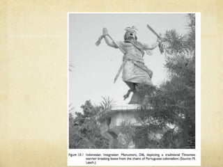 East Timor has a complex cultural heritage formed by its 450 year resistance against foreign occupiers including Portugal, Indonesia, and its current status as an independent nation. This cultural heritage includes memorial sites commemorating independence struggles and human rights abuses under occupation. There is ongoing debate between older and younger generations about how to characterize the nation's identity and historical narrative. East Timor aims to unify its people through preserving diverse aspects of its cultural legacy while acknowledging different experiences of colonialism.