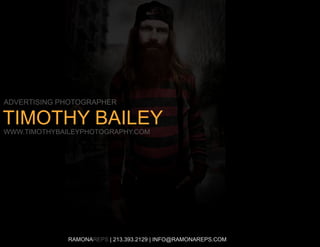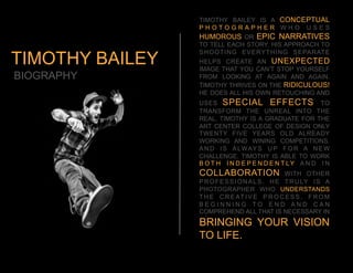 Timothy Bailey is a conceptual photographer known for using humorous or epic narratives in his photoshoots. He shoots each element of his photos separately to create unexpected images that capture viewers' attention. Though only 25 years old, Timothy is already successful, having graduated from the Art Center College of Design and winning competitions. He is skilled at both independent and collaborative work.