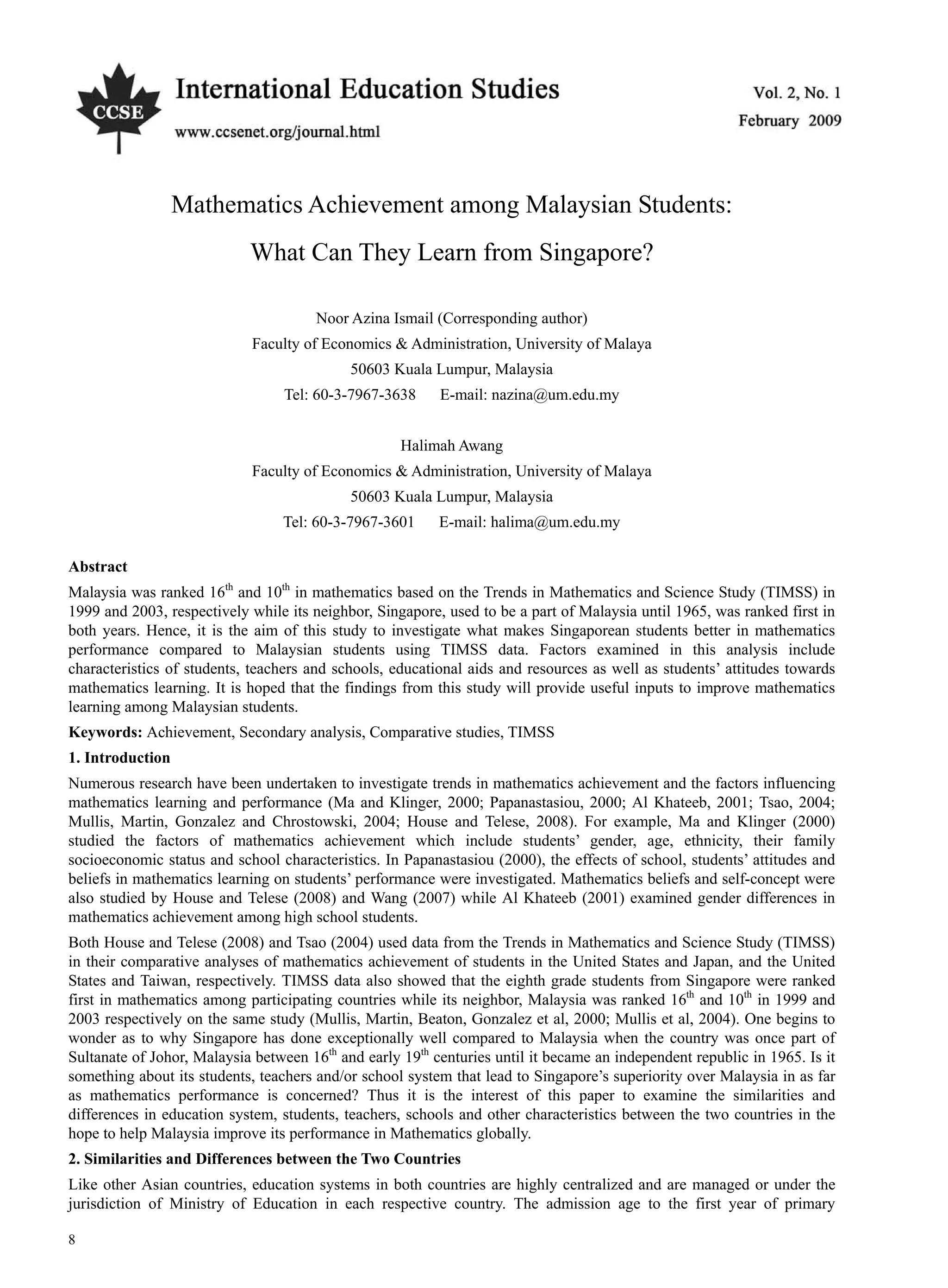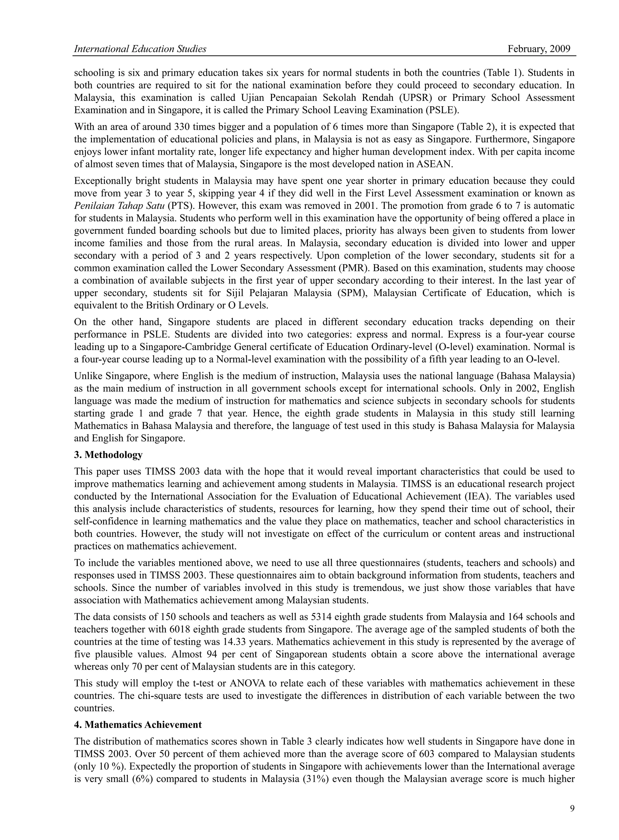 This study analyzed TIMSS 2003 data to investigate factors contributing to Singaporean students outperforming Malaysian students in mathematics. It found Singaporean students scored significantly higher overall and in all content areas. Singapore had advantages in resources like computer ownership. Characteristics like gender, parents' education, resources and attitudes significantly impacted achievement in both countries. Teacher characteristics mattered more for Malaysian students. The differences were largely due to Singapore's greater socioeconomic homogeneity and better implementation of strategies, rather than differences in characteristics between the countries.
