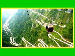 Tianmen Mountain in Hunan Province, China is known for its 99 sharp turns to reach the summit by road and 999 steps to climb at the end. Alternatively, a cable car rises over 4,200 feet in 7.5 km. At the top are stunning views and structures like a natural stone arch formed by a cave collapse in 263AD, a temple, and the world's highest natural water-eroded cave running through the mountain. In modern times, pilots have flown planes through the large arch opening for stunts televised around the world.