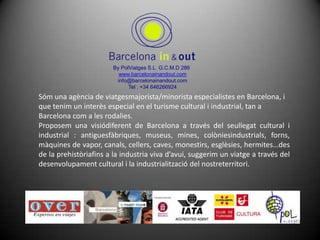 By PolViatges S.L.G.C.M.D 286www.barcelonainandout.cominfo@barcelonainandout.comTel : +34 646266924Sóm una agència de viatgesmajorista/minorista especialistes en Barcelona, i que tenim un interès especial en el turisme cultural i industrial, tan a Barcelona com a les rodalies.Proposem una visiódiferent de Barcelona a través del seullegat cultural i industrial : antiguesfàbriques, museus, mines, colòniesindustrials, forns, màquines de vapor, canals, cellers, caves, monestirs, esglèsies, hermites…des de la prehistòriafins a la industria viva d’avui, suggerim un viatge a través del desenvolupament cultural i la industrialització del nostreterritori.