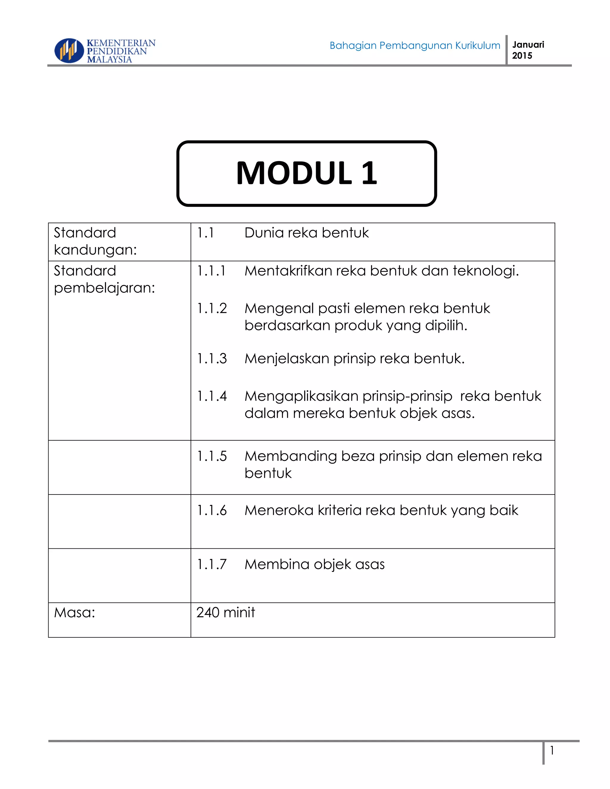 Dokumen ini membincangkan tentang kurikulum pengajaran reka bentuk dan teknologi, termasuk definisi, elemen, dan prinsip reka bentuk. Ia menerangkan tentang kriteria reka bentuk yang baik dan cara mengaplikasikan prinsip-prinsip reka bentuk dalam menghasilkan objek asas. Selain itu, terdapat juga aktiviti yang melibatkan pengenalan elemen reka bentuk kepada murid dan cara mereka untuk memahami serta mempraktikannya.