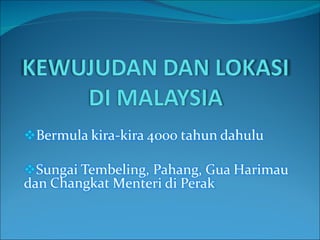 Dokumen ini membahas tiga zaman prasejarah di Malaysia: Paleolitik, Neolitik, dan Logam. Zaman Paleolitik dicirikan oleh cara hidup berpindah, peralatan dari batu, dan kepercayaan animisme, sedangkan zaman Neolitik menandakan permulaan masyarakat menetap dengan kerajinan tembikar dan pertanian. Zaman Logam diikuti dengan penggunaan alat logam dan perdagangan.
