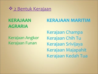 Dokumen ini membahas tentang bentuk kerajaan awal di Asia Tenggara, terutama membedakan antara kerajaan agraris dan maritim. Kerajaan agraris berlokasi di pedalaman dan berfokus pada pertanian, sedangkan kerajaan maritim berlokasi di pesisir laut dan berfokus pada perdagangan laut. Beberapa contoh kerajaan maritim yang dijelaskan adalah Srivijaya, Champa, Chih Tu, dan Majapahit.