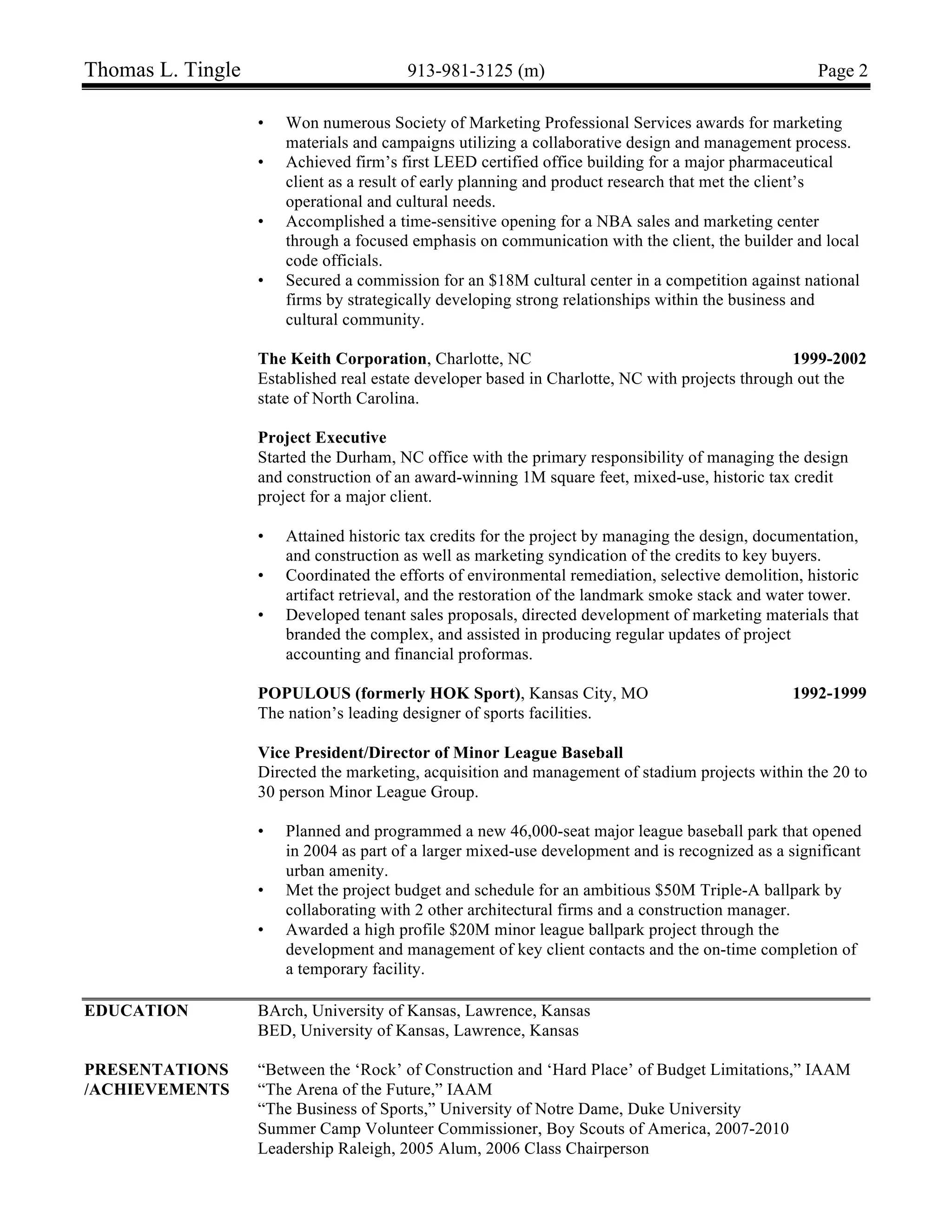 Thomas L. Tingle is a business development executive with over 25 years of experience in architecture, engineering, construction, and real estate development. He has a proven track record of strategic planning and relationship building that has led to over $500 million in project wins. Tingle specializes in sports and entertainment facilities, mixed-use developments, and historic renovations.