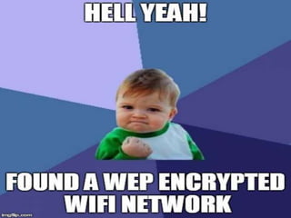 This document discusses wireless network security. It begins by outlining the basics of wireless LANs including operating frequencies, channels, and SSIDs. It then describes several common wireless attacks such as obtaining hidden SSIDs, bypassing MAC filters, evil twin attacks, and cracking WEP/WPA encryption. Finally, it provides tips for securing a wireless network, including using WPA2 encryption with a strong password, enabling the router's firewall, and reducing the WiFi range.