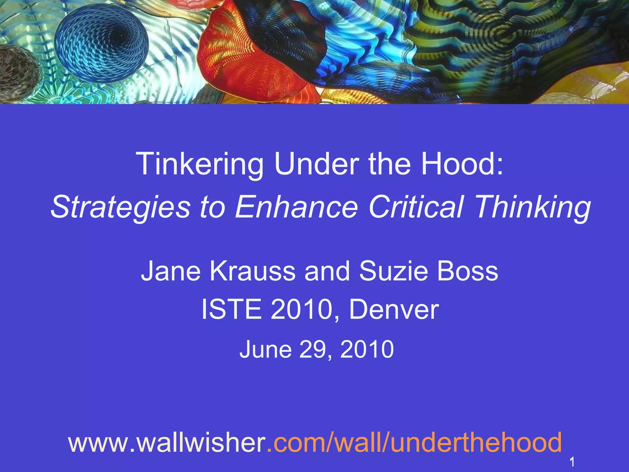 The document discusses strategies for enhancing critical thinking through project-based learning (PBL) and inquiry cycles, emphasizing tools for making thinking visible. It includes crowd-sourced contributions from participants on effective thinking routines and technology tools that support inquiry. For further details and resources, links to various platforms and participant ideas are provided.