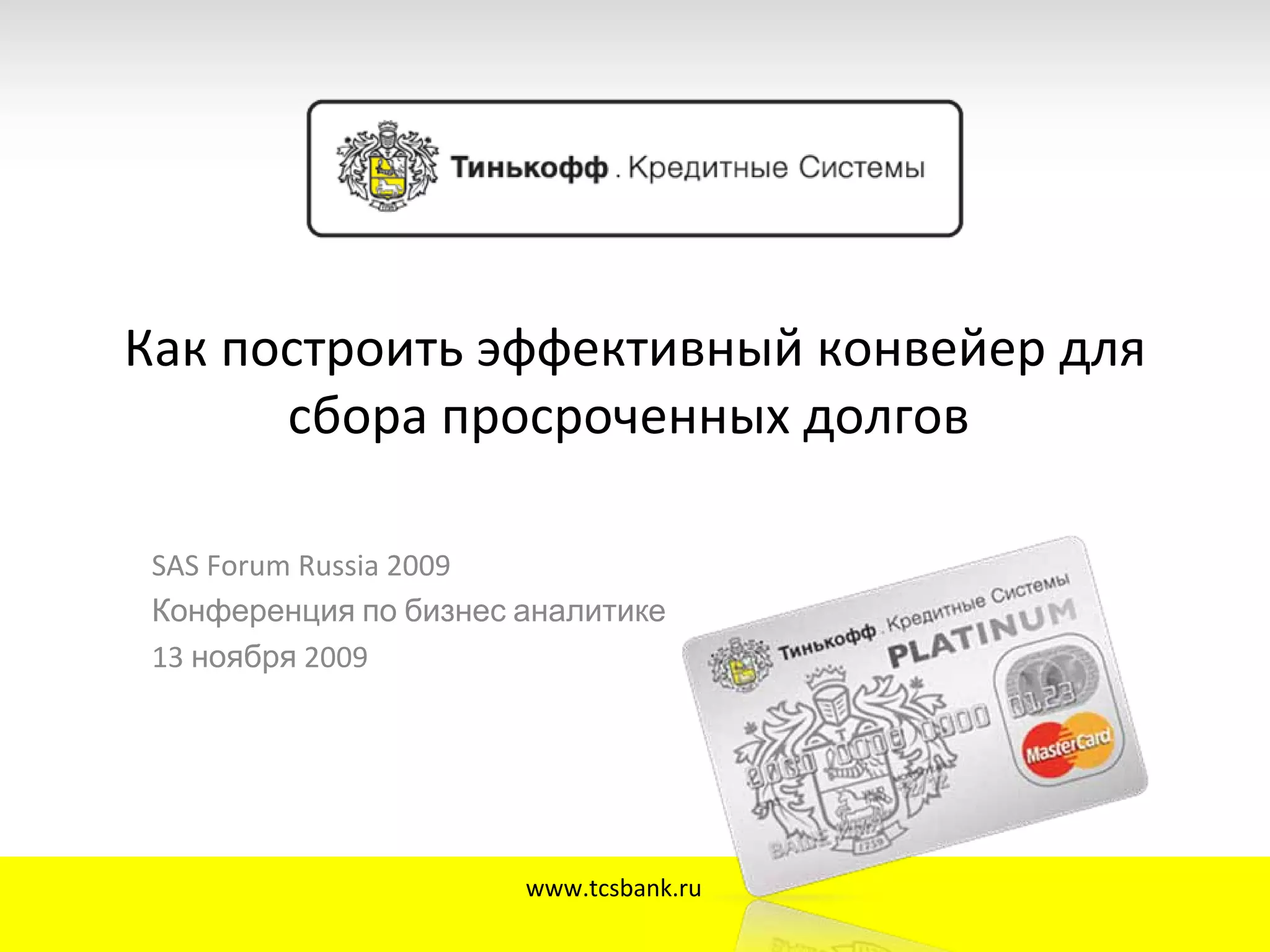 Документ описывает стратегию и методы построения эффективного конвейера для сбора просроченных долгов в Тинькофф Кредитные Системы. Основное внимание уделяется внедрению аналитической системы оценки риска и управлению автоматическими каналами коммуникации, что приводит к снижению просроченной задолженности и затрат на сбор долгов. Также документ охватывает этапы запуска и управления процессами, направленные на повышениe производительности и эффективности работы с должниками.
