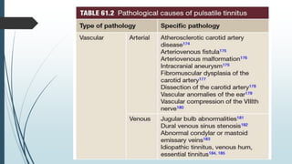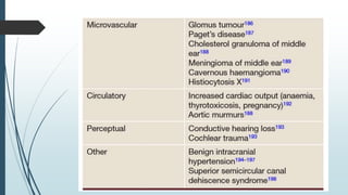 This document provides information on tinnitus and hyperacusis. It defines tinnitus as the perception of sound without an external stimulus. It discusses the prevalence, risk factors, pathophysiology, investigations, and treatments for both subjective and pulsatile tinnitus. A variety of mainstream and alternative treatment approaches are covered, including sound therapy, medications, and surgery. The document also examines hyperacusis and its relationship to tinnitus.