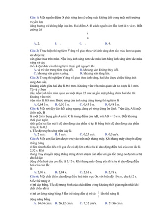Đề thi tuyển sinh đại học năm 2011 môn Vật lý bao gồm 40 câu hỏi, liên quan đến nhiều chủ đề như sóng âm, giao thoa ánh sáng, dao động điều hòa, điện từ, và quang học. Tài liệu cung cấp các thông số vật lý cơ bản và yêu cầu thí sinh áp dụng lý thuyết để giải quyết các bài toán thực tế. Đề thi có cấu trúc rõ ràng và thể hiện yêu cầu kiến thức sâu về Vật lý.
