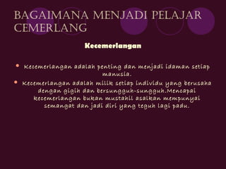 Dokumen tersebut memberikan tips bagaimana menjadi pelajar cemerlang dengan menekankan pentingnya memiliki tujuan dan cita-cita tinggi, mengurus waktu dengan baik, belajar secara konsisten, memiliki keyakinan diri yang kuat, serta minat dan semangat belajar yang tinggi.