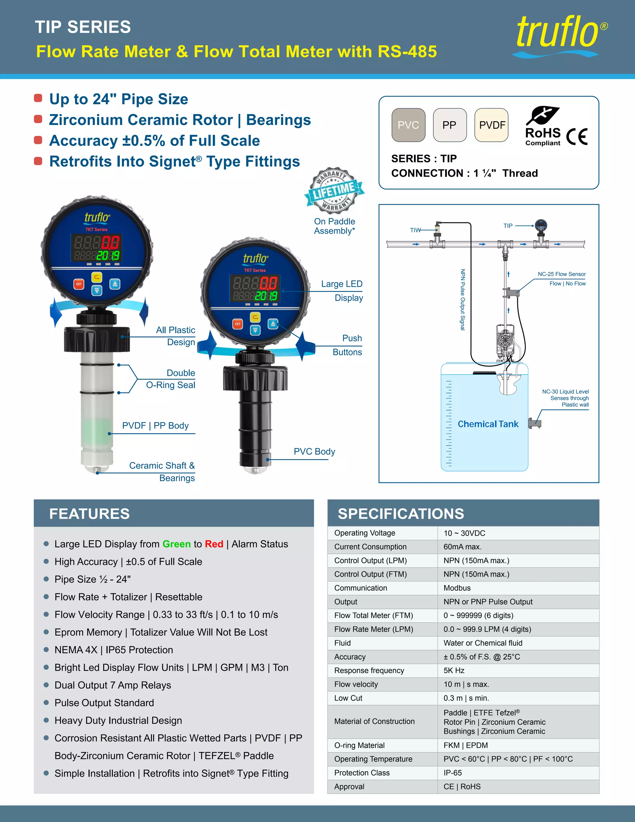 This document provides specifications for a TIP Series flow rate and totalizer meter that can measure flow rates from 0.1-10 m/s or 0.3-33.3 ft/s in pipes from 1/2-24 inches. It has a ceramic rotor and bearings, accuracy of ±0.5% of full scale, and outputs flow rate and totalizer data via Modbus RTU communication or pulse outputs. The meter body can be made of PVC, polypropylene, or PVDF plastic and is IP65 rated.