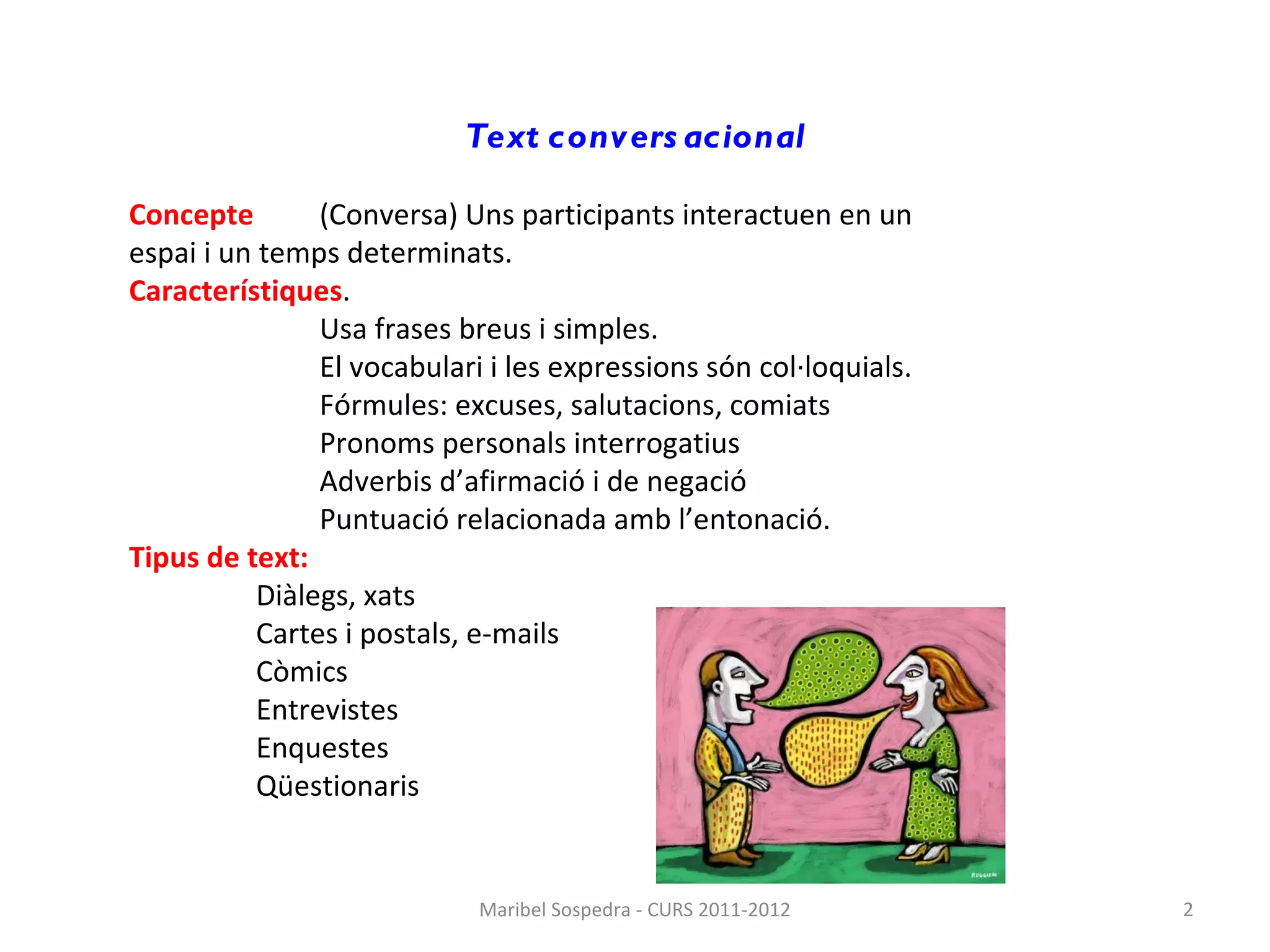 Text conversacional Concepte (Conversa) Uns participants interactuen en un espai i un temps determinats. Característiques . Usa frases breus i simples. El vocabulari i les expressions són col·loquials. Fórmules: excuses, salutacions, comiats Pronoms personals interrogatius Adverbis d’afirmació i de negació Puntuació relacionada amb l’entonació. Tipus de text: Diàlegs, xats Cartes i postals, e-mails Còmics Entrevistes Enquestes Qüestionaris Maribel Sospedra - CURS 2011-2012