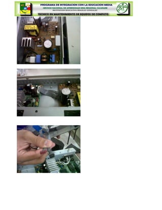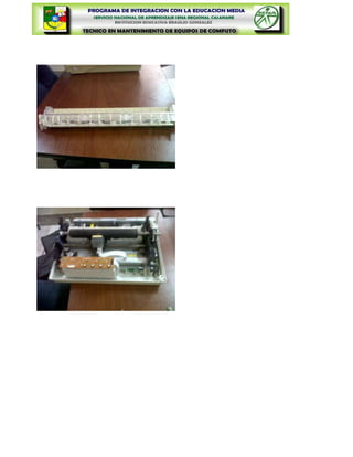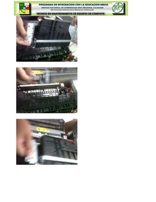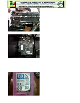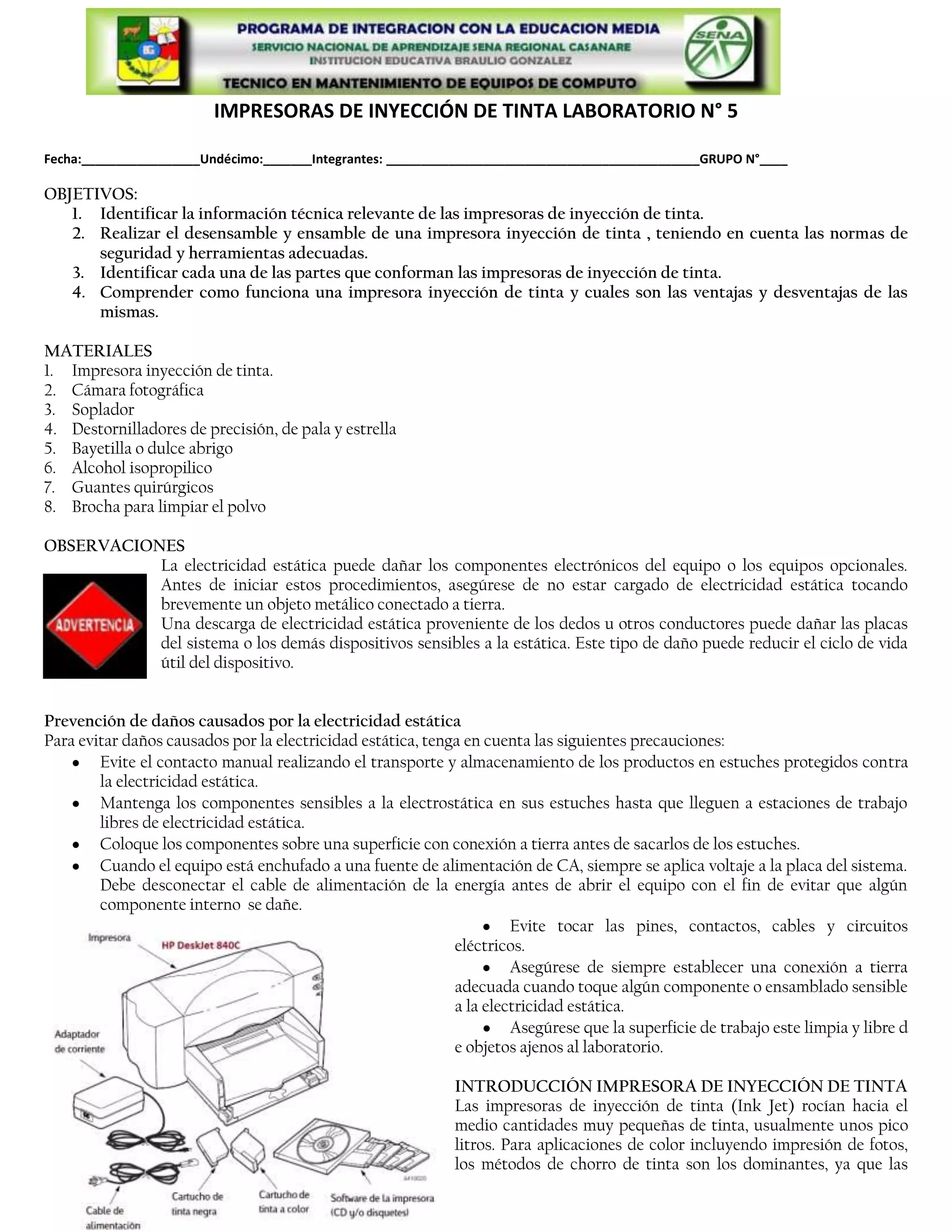 Este documento presenta los objetivos y materiales necesarios para realizar un laboratorio sobre impresoras de inyección de tinta. Los objetivos incluyen identificar la información técnica de las impresoras de inyección de tinta, realizar el desensamble y ensamble siguiendo normas de seguridad, e identificar las partes internas. El documento también advierte sobre los riesgos de la electricidad estática y cómo prevenir daños, e introduce brevemente cómo funcionan las impresoras de inyección de tinta.