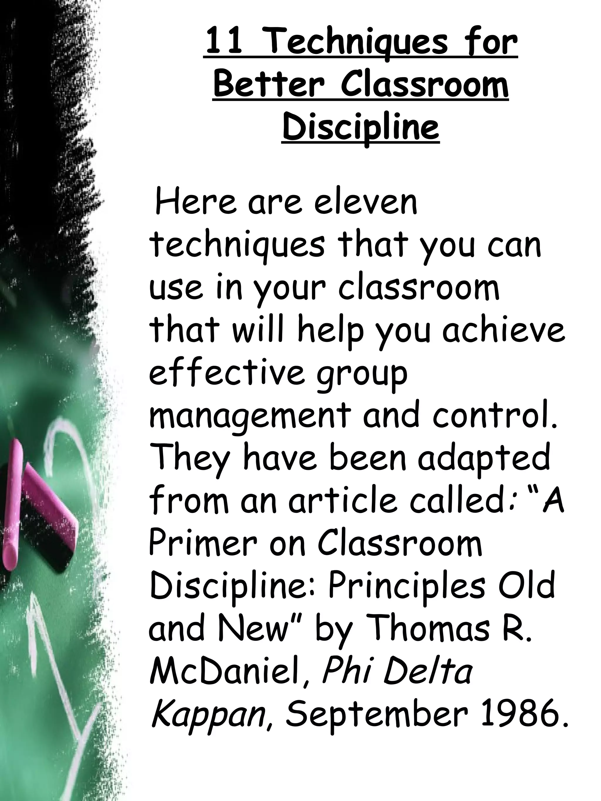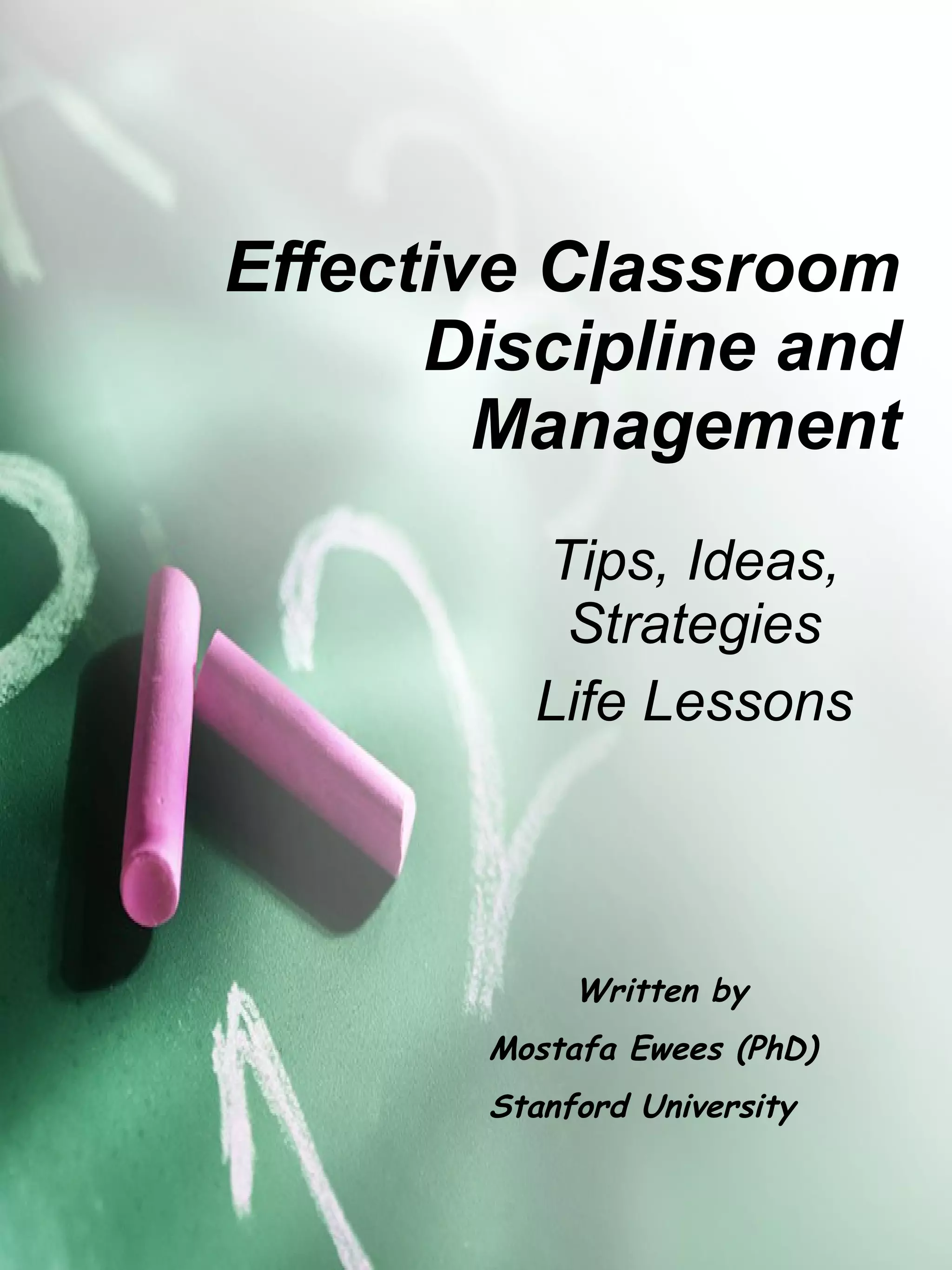 The document provides 52 techniques, strategies, and concepts for effective classroom management and discipline as outlined by experts Harry K. Wong and Thomas R. McDaniel. The techniques include focusing student attention, direct instruction of lesson plans, monitoring student work, modeling positive behaviors, using non-verbal cues, controlling the classroom environment, intervening assertively but with a low profile, setting clear rules and consequences, using positive reinforcement, and matching teaching styles to student learning styles.