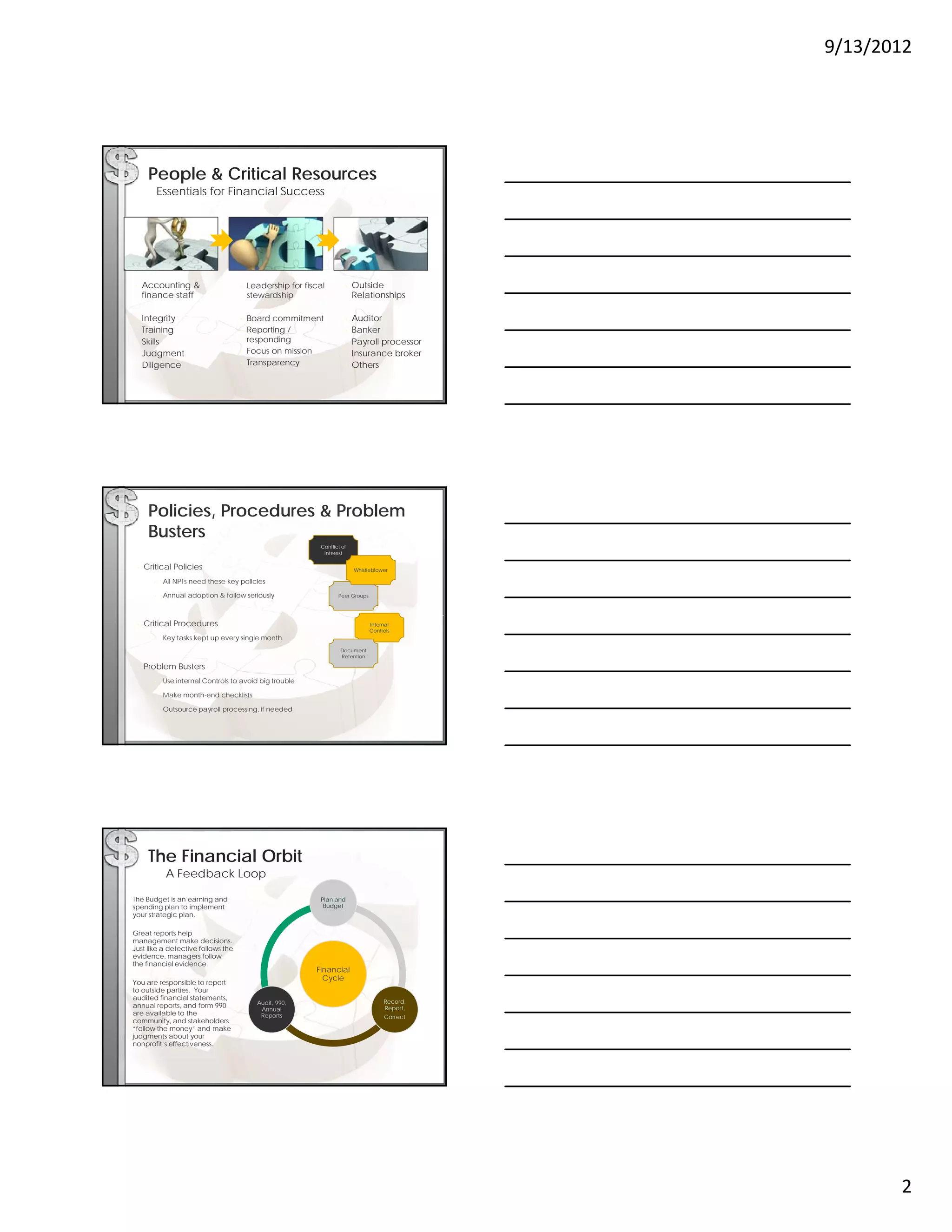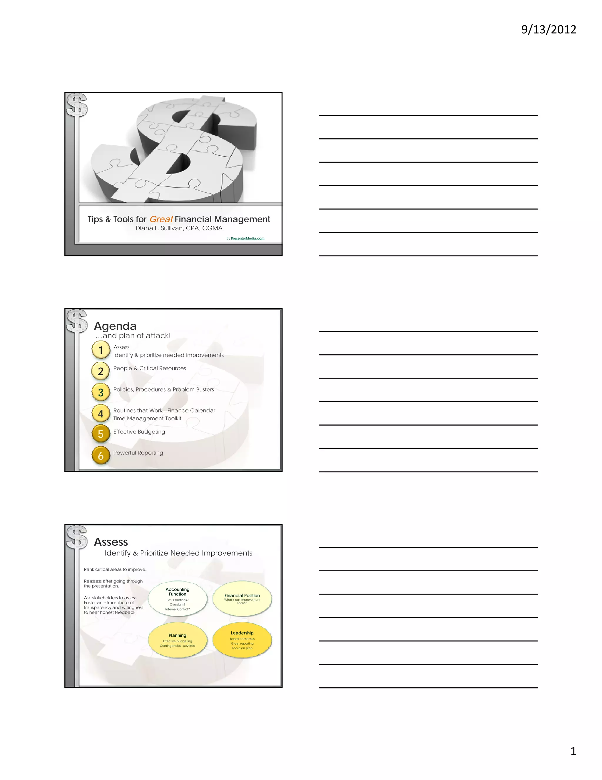 1) The document provides tips and tools for effective financial management, including assessing critical areas for improvement, establishing policies and procedures, creating routines like a finance calendar, and effective budgeting and reporting.