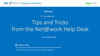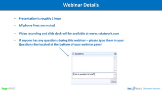 The webinar provided 10 tips for optimizing the use of Sage HRMS, including importing calculations, setting up group term life insurance, customizing the login page, managing user preferences and licenses, changing employee numbering, and recommending improvements to Sage. The presentation lasted around an hour, included opportunities for questions, and would make the recording and slides available online.