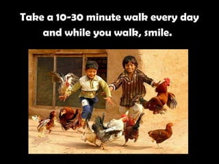 The document provides tips for living a beautiful life, including taking daily walks while smiling, spending silent time each day, focusing on purpose and positivity, spending time with both the elderly and young children, making others smile, forgiving others, staying in touch with friends, living in the present, and being thankful. The overall message is to appreciate each day, focus on personal growth, and find the beauty in life through positive relationships and attitudes.